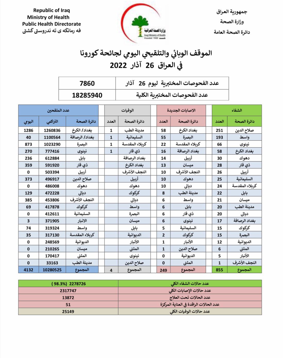 أعلنت وزارة الصحة، اليوم السبت، الموقف الوبائي اليومي لجائحة كورونا في عموم العراق.