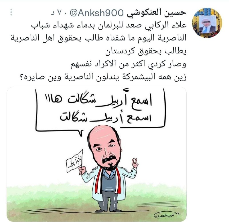 حسين العنكوشي مغردا حول اصطفاف علاء الركابي مع الديمقراطي الكردستاني لارسال نفط الجنوب الى كردستان