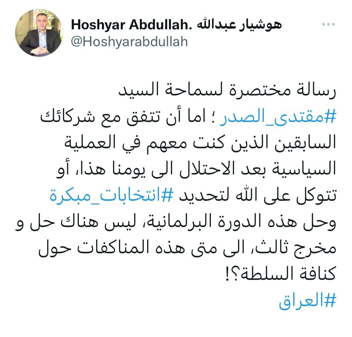 النائب الكردي السابق هوشيار عبد الله يوجه رسالة الى الصدر عبر تغريدة …الى متى هذه المناكفات حول كنافة السلطة”!