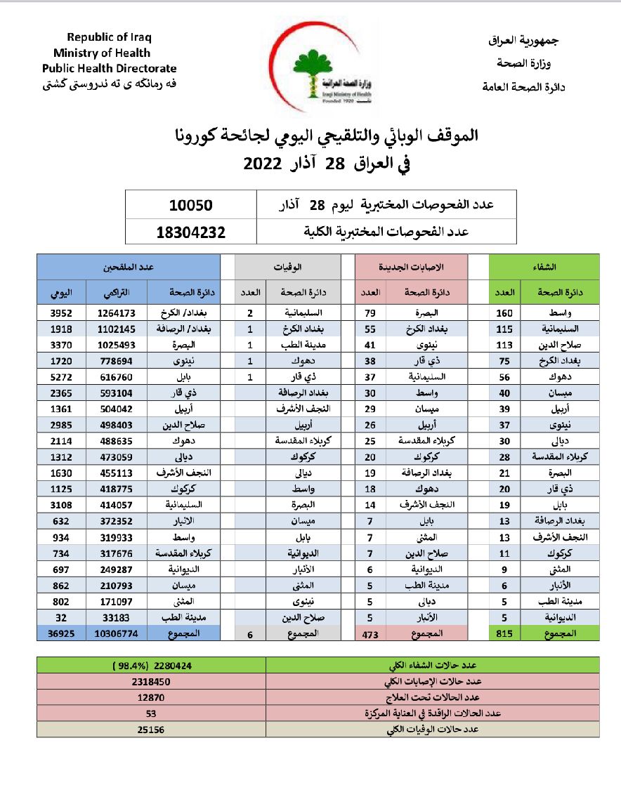 أعلنت وزارة الصحة، اليوم الاثنين، الموقف الوبائي اليومي لجائحة كورونا في عموم العراق.
