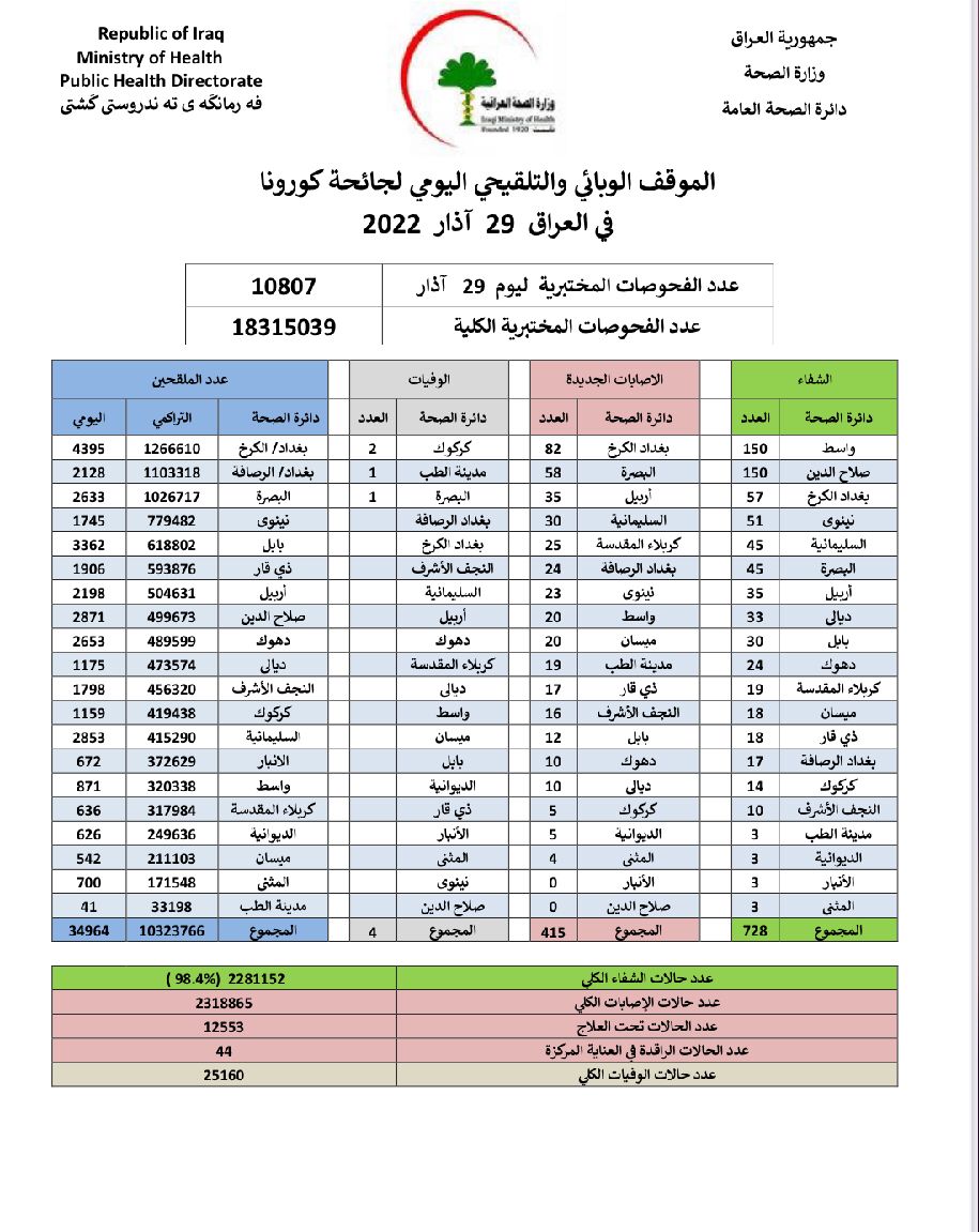 أعلنت وزارة الصحة، اليوم الثلاثاء، الموقف الوبائي اليومي الخاص بجائحة كورونا في عموم العراق.