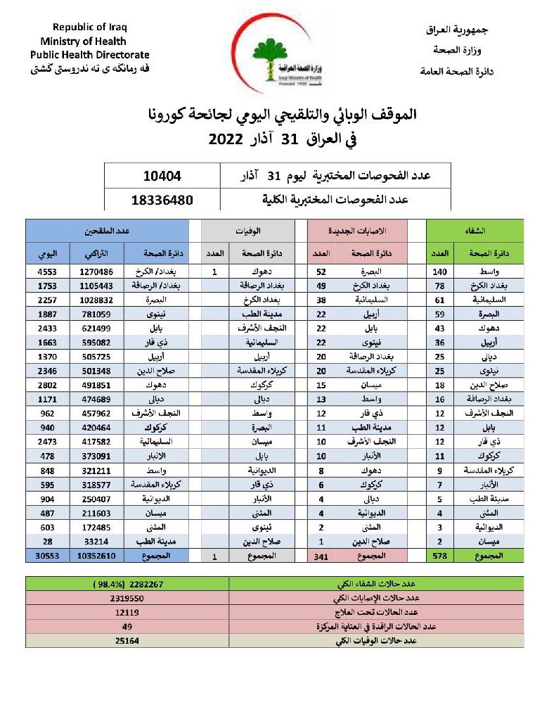 أعلنت وزارة الصحة، اليوم الخميس، الموقف الوبائي اليومي الخاص بجائحة كورونا في العراق.