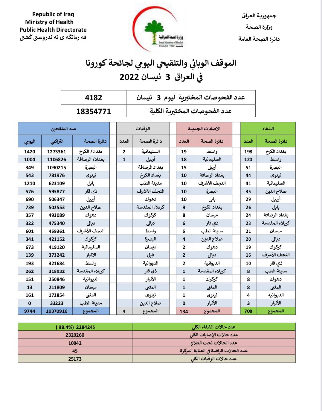 أعلنت وزارة الصحة، اليوم الأحد، الموقف الوبائي والتلقيحي اليومي لجائحة كورونا في العراق.