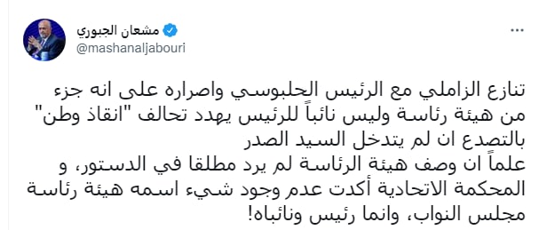 تغريدة.. مشعان الجبوري: صراع الزاملي مع الحلبوسي سيتسبب بتصدع التحالف الثلاثي