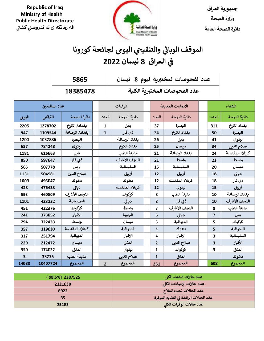 أعلنت وزارة الصحة، اليوم الجمعة، الموقف الوبائي اليومي لجائحة كورونا في عموم العراق.