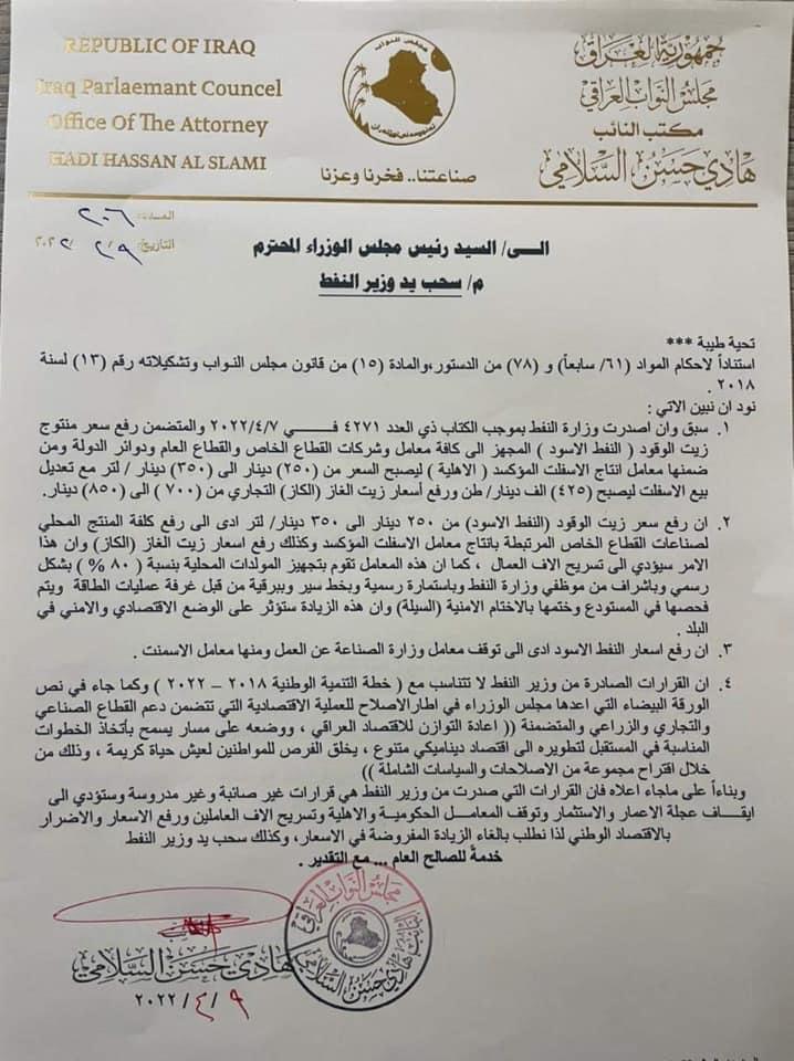 وقال السلامي في حديث صحفي، إن "وزير النفط في حكومة تصريف الأعمال أصدر قرارات في رفع أسعار الوقود وهذه قرارات متخبطة وغير صحيحة وتؤدي الى تدمير ما تبقى من الصناعة المحلية كما تؤدي الى تسريح عشرات الآلاف من العاملين في تلك القطاعات ناهيك عن الأضرار التي تتسبب بها على الشعب العراقي"،