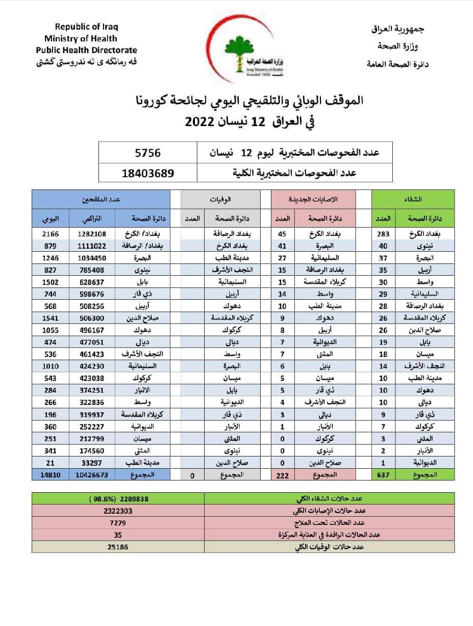 أعلنت وزارة الصحة، اليوم الثلاثاء، الموقف الوبائي لجائحة كورونا في عموم العراق.