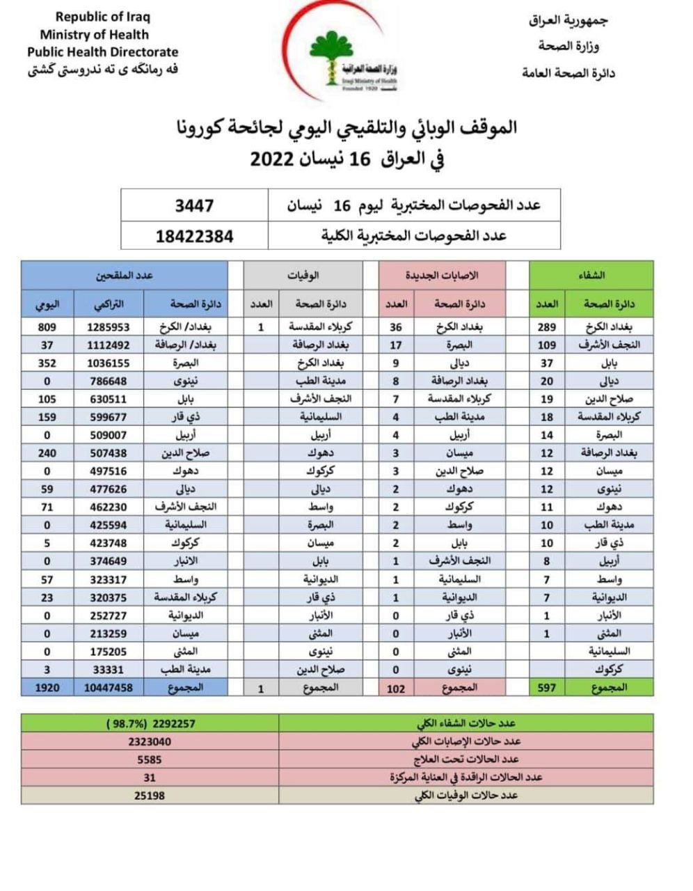 أعلنت وزارة الصحة، اليوم السبت، الموقف الوبائي اليومي لجائحة كورونا في العراق.