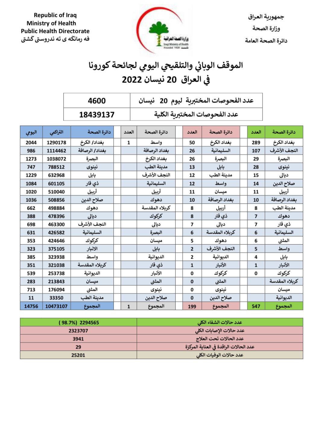 أعلنت وزارة الصحة، اليوم الأربعاء، الموقف الوبائي والتلقيحي اليومي لجائحة كورونا في العراق.