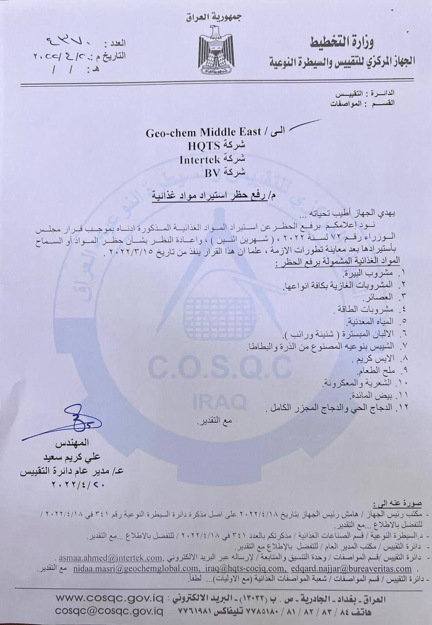 أعلنت وزارة التخطيط، اليوم الخميس، رفع حظر الاستيراد عن 12 مادة غذائية.