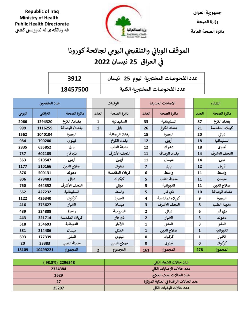 أعلنت وزارة الصحة، اليوم الاثنين، الموقف الوبائي اليومي لجائحة كورونا في عموم العراق.