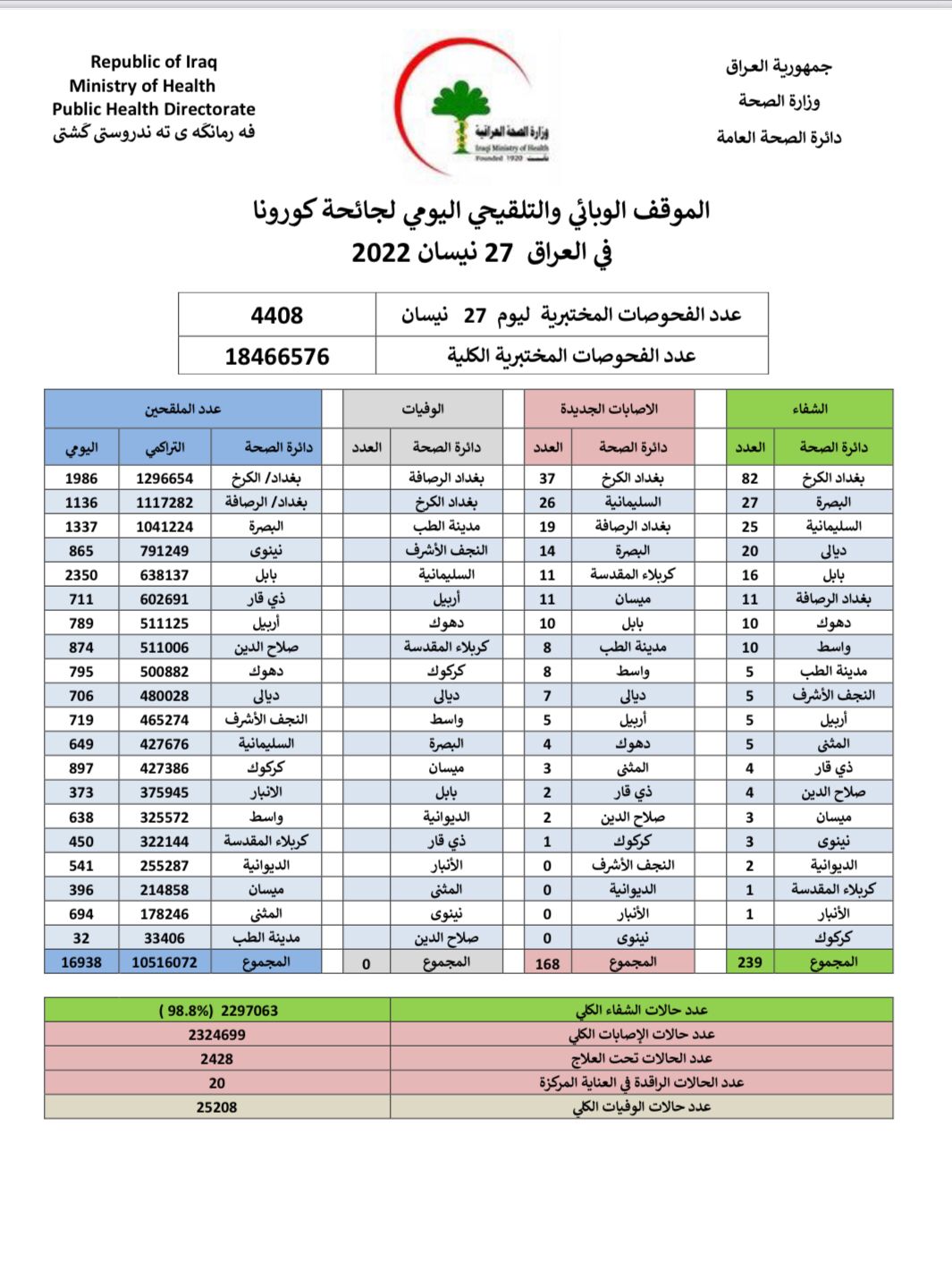 أعلنت وزارة الصحة، اليوم الأربعاء، الموقف الوبائي اليومي الخاص بجائحة كورونا في عموم العراق.
