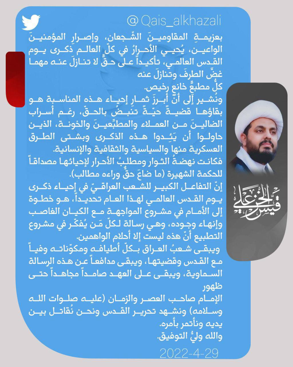 الشيخ قيس الخزعلي يشيد بالتفاعل الشعبي لاحياء يوم القدس.. خطوة لمواجهة الكيان الغاصب