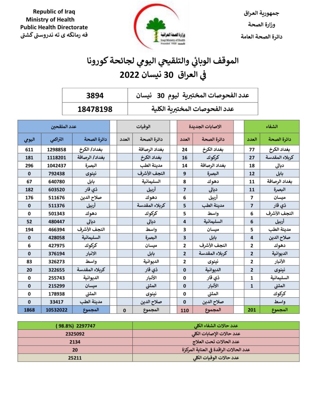 أعلنت وزارة الصحة، اليوم السبت، الموقف الوبائي اليومي الخاص بجائحة كوورنا في عموم العراق.