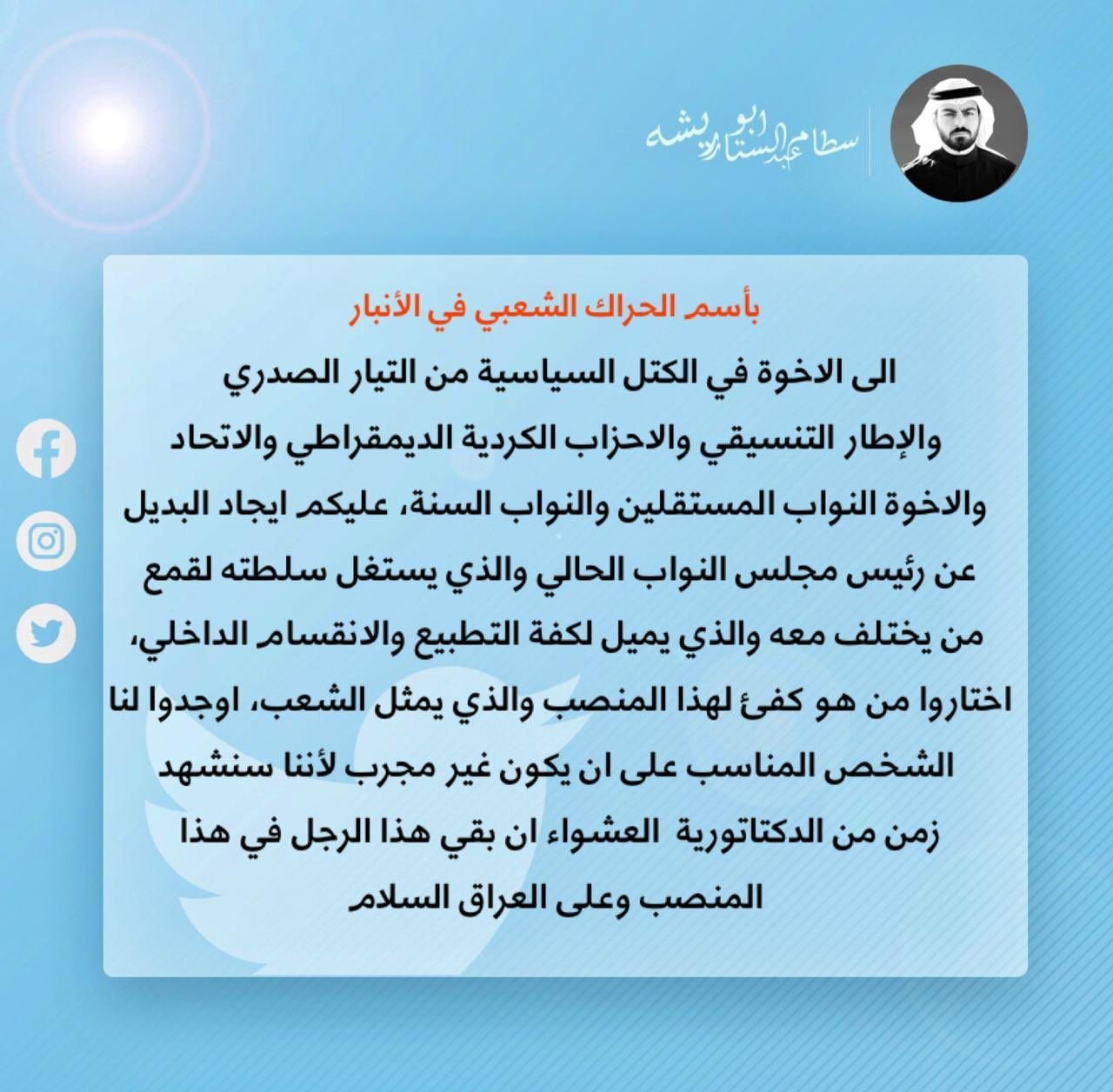 بالتغريدة.. سطام أبو ريشة يدعو لتغيير الحلبوسي: يستغل سلطته للقمع ويميل لكفة التطبيع