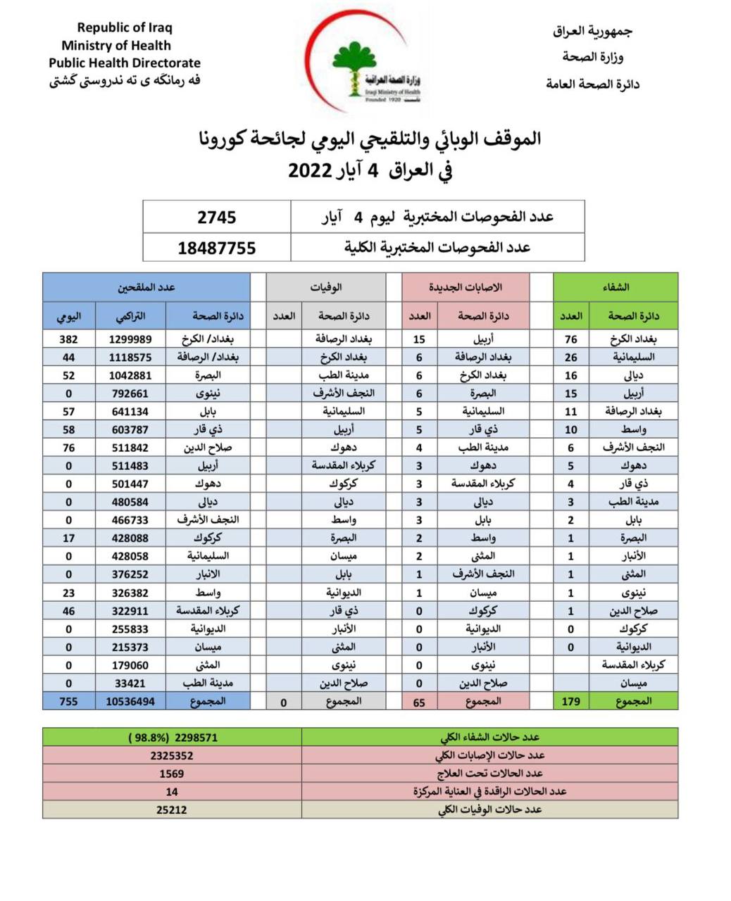 وأوضح البيان، أنه "لم تسجل اي حالة وفاة بكورونا في عموم محافظات البلاد"، لافتا إلى أن "الأشخاص الذين تلقوا اللقاح خلال 24 ساعة بلغ عددهم 755".
