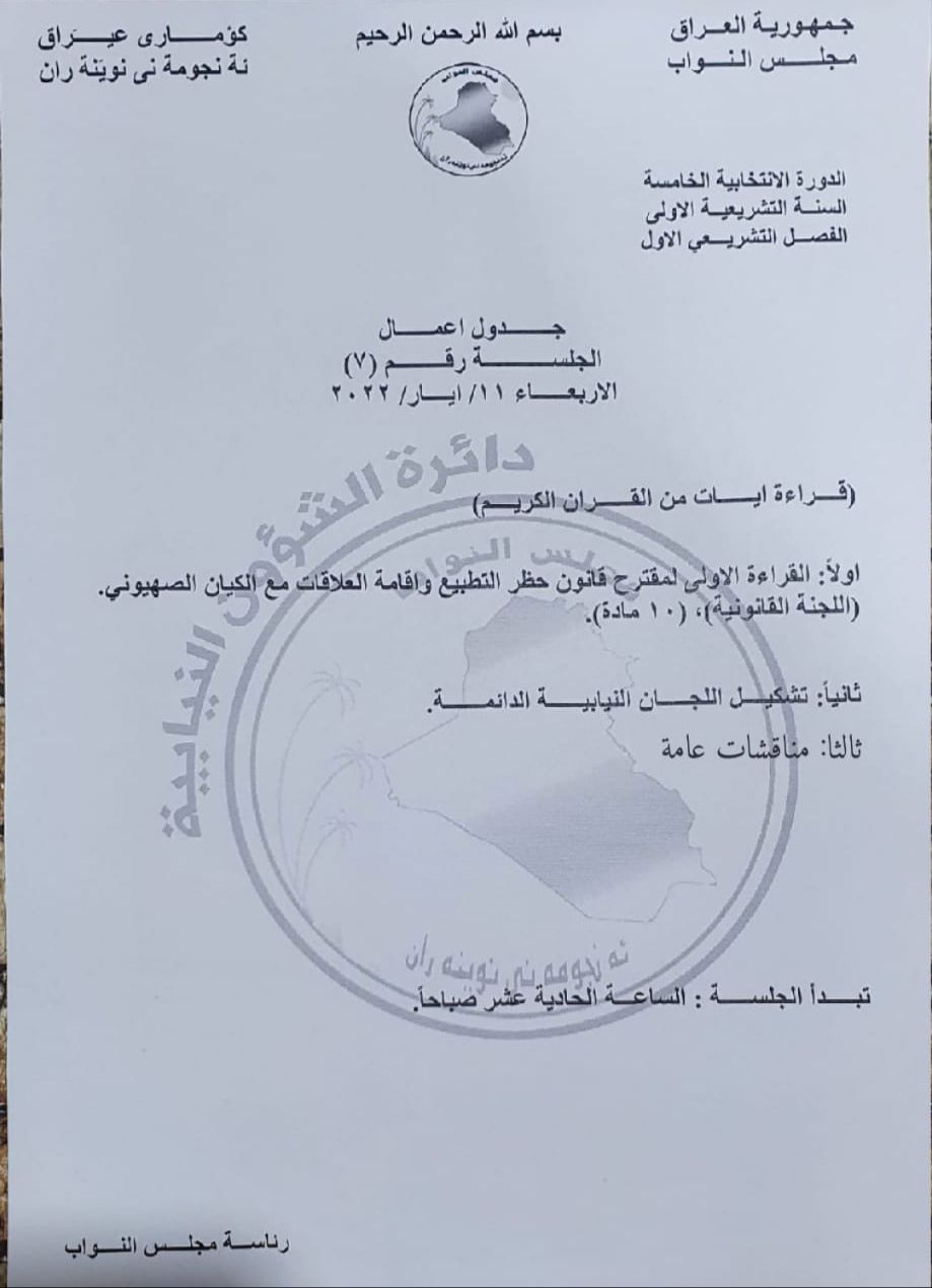 ويتضمن جدول الأعمال "القراءة الاولى لمقترح قانون حظر التطبيع واقامة العلاقات مع الكيان الصهيوني".