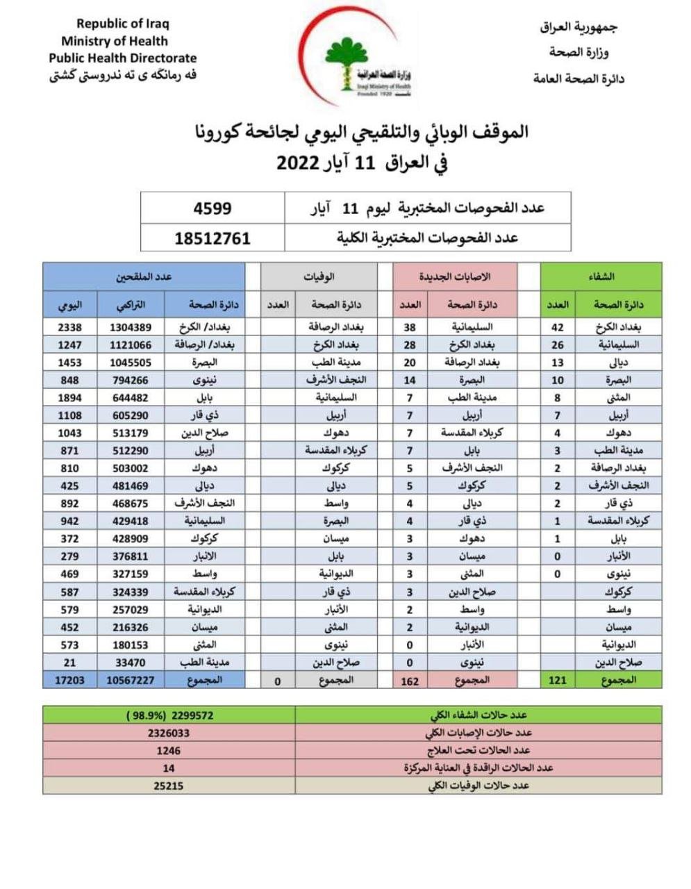 أعلنت وزارة الصحة، اليوم الأربعاء، الموقف الوبائي اليومي لجائحة كورونا في العراق.