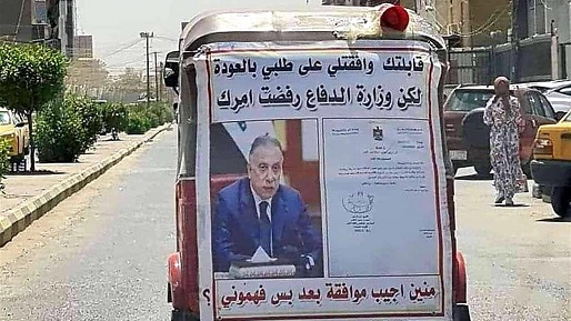 وأظهرت صورة نشرت على مواقع التواصل الاجتماعي، سائق عجلة "تكتك" يضع لافتة عليها صورة الكاظمي، وكتب: "قابلتك ووافقت على طلبي بالعودة، لكن وزارة الدفاع رفضت أمرك".