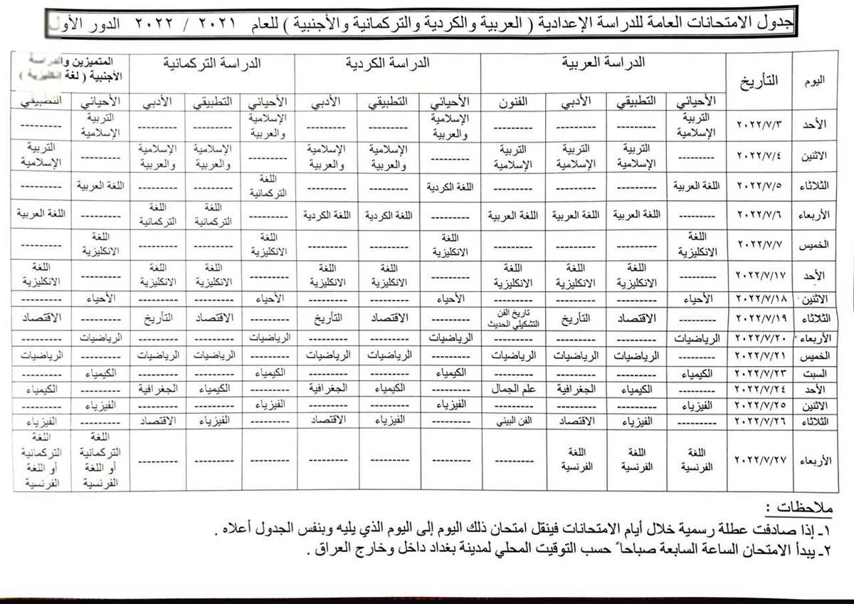 اعلنت وزارة التربية، اليوم الخميس، جدول امتحانات الدور الاول للدراسة الاعدادية للعام الدراسي 2021 - 2022.