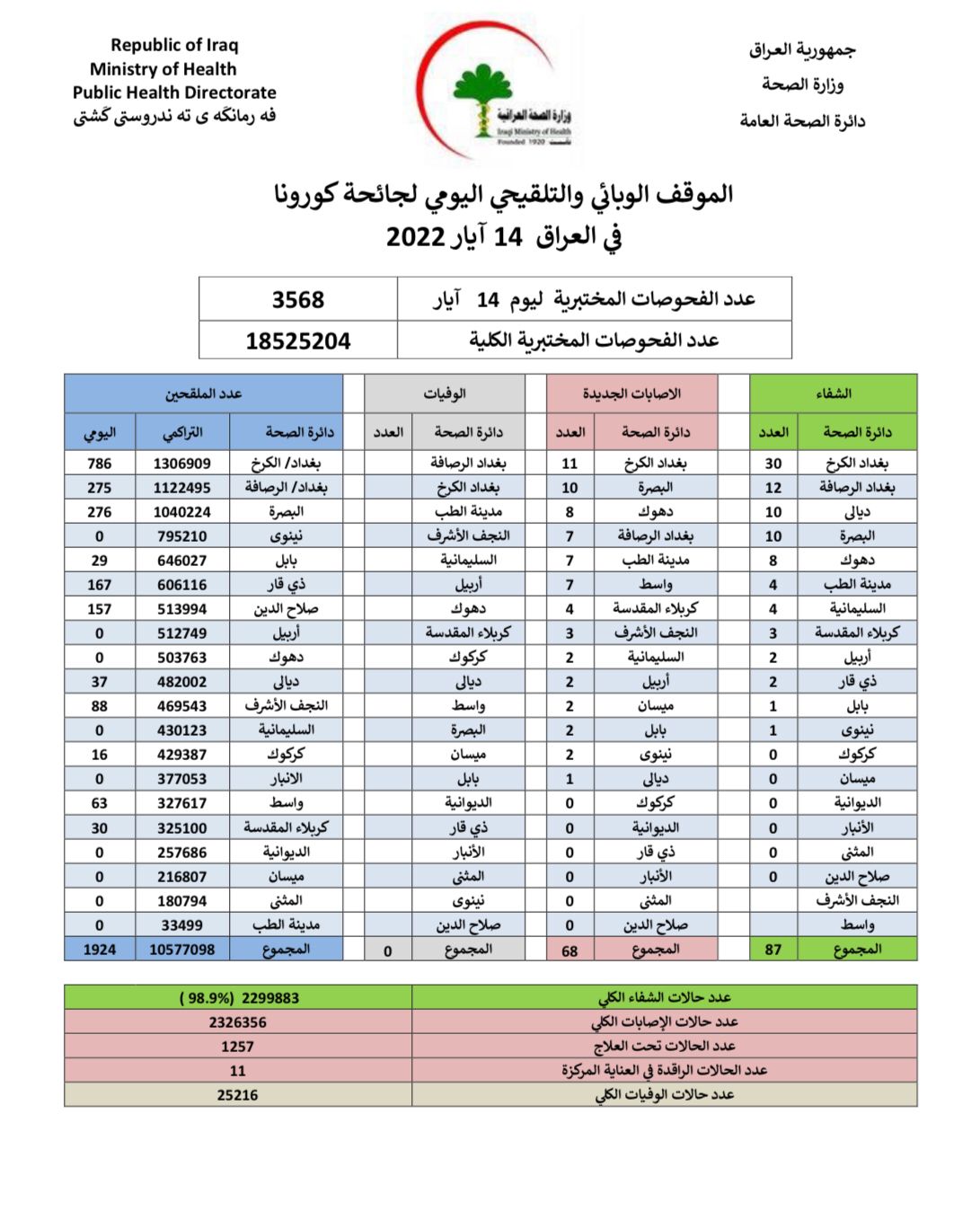 أعلنت وزارة الصحة، اليوم السبت، الموقف الوبائي والتلقيحي اليومي لجائحة كورونا في العراق.