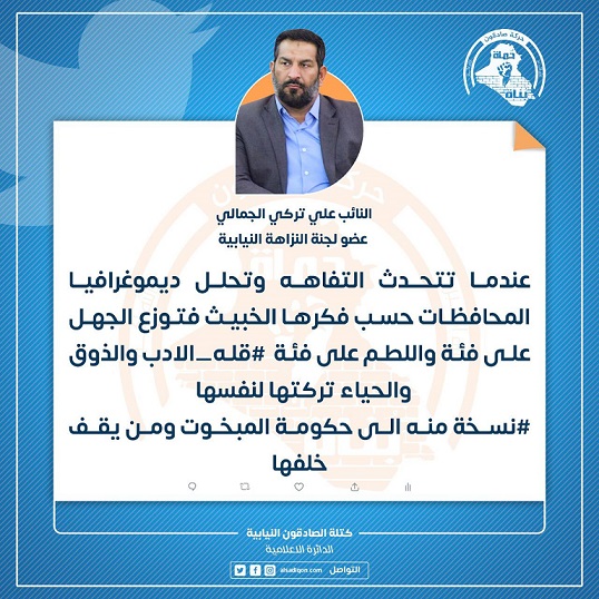 قال النائب علي التركي الجمالي، عندما تتحدث التفاهه وتحلل ديموغرافيا المحافظات حسب فكرها الخبيث فتوزع الجهل على فئة واللطم على فئة #قله_الادب والذوق والحياء تركتها لنفسها.