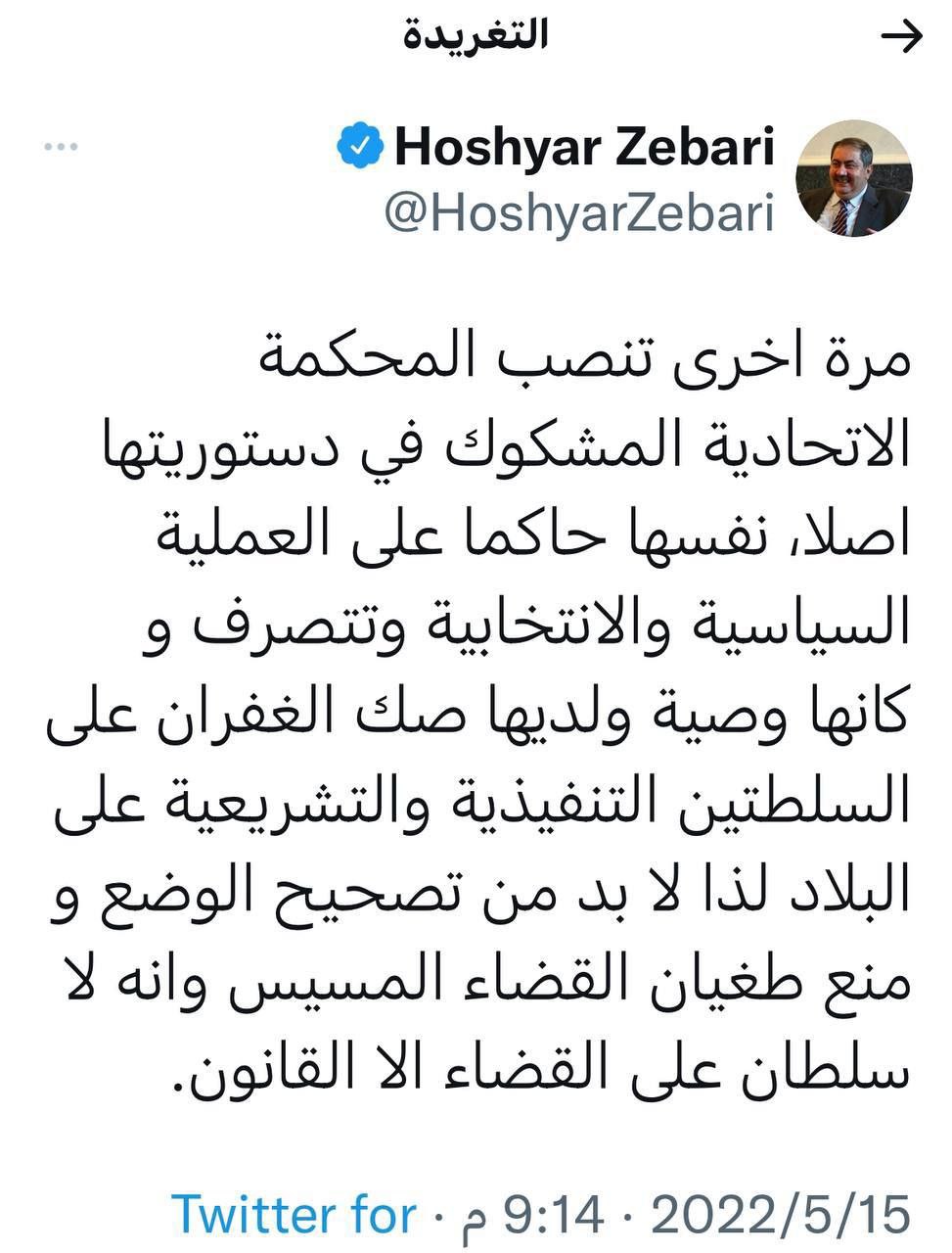 هوشيار زيباري يتطاول على المحكمة الاتحادية ويعتبرها طاغية ومسيسة