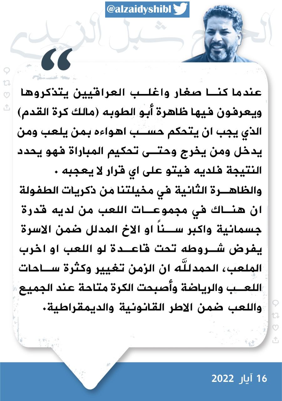 وقال الزيدي في بيان له، إن "الزمن تغيير وكثرة ساحات اللعب والرياضة واصبحت الكرة متاحة عند الجميع".