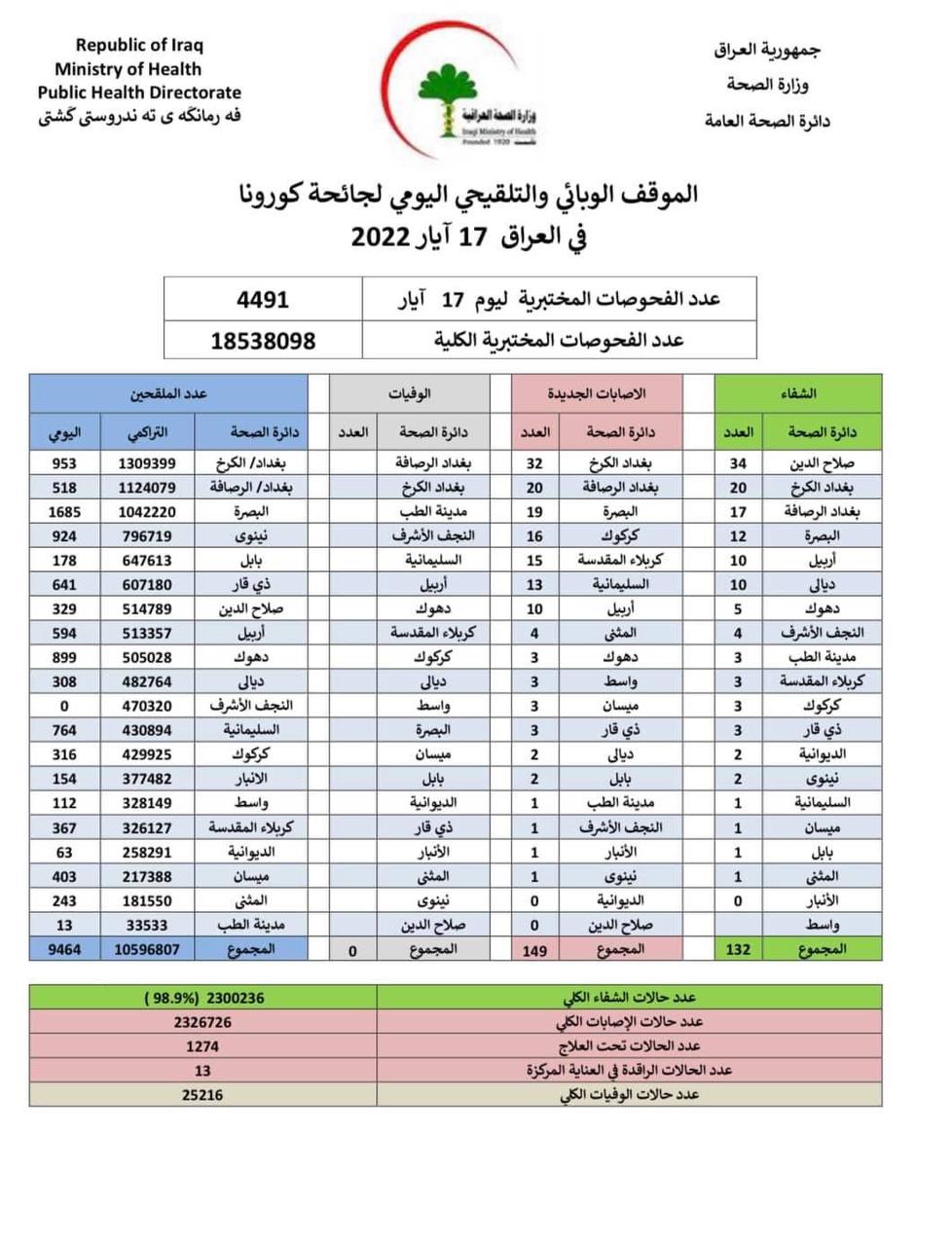 وذكرت الوزارة في بيان أن كوادرها الصحية "سجلت في عموم المحافظات العراقية 149 إصابة جديدة بكورونا فيما تماثل 132 مصاباً إلى الشفاء، ولم يتم تسجيل أية حالة وفاة خلال المدة المذكورة".
