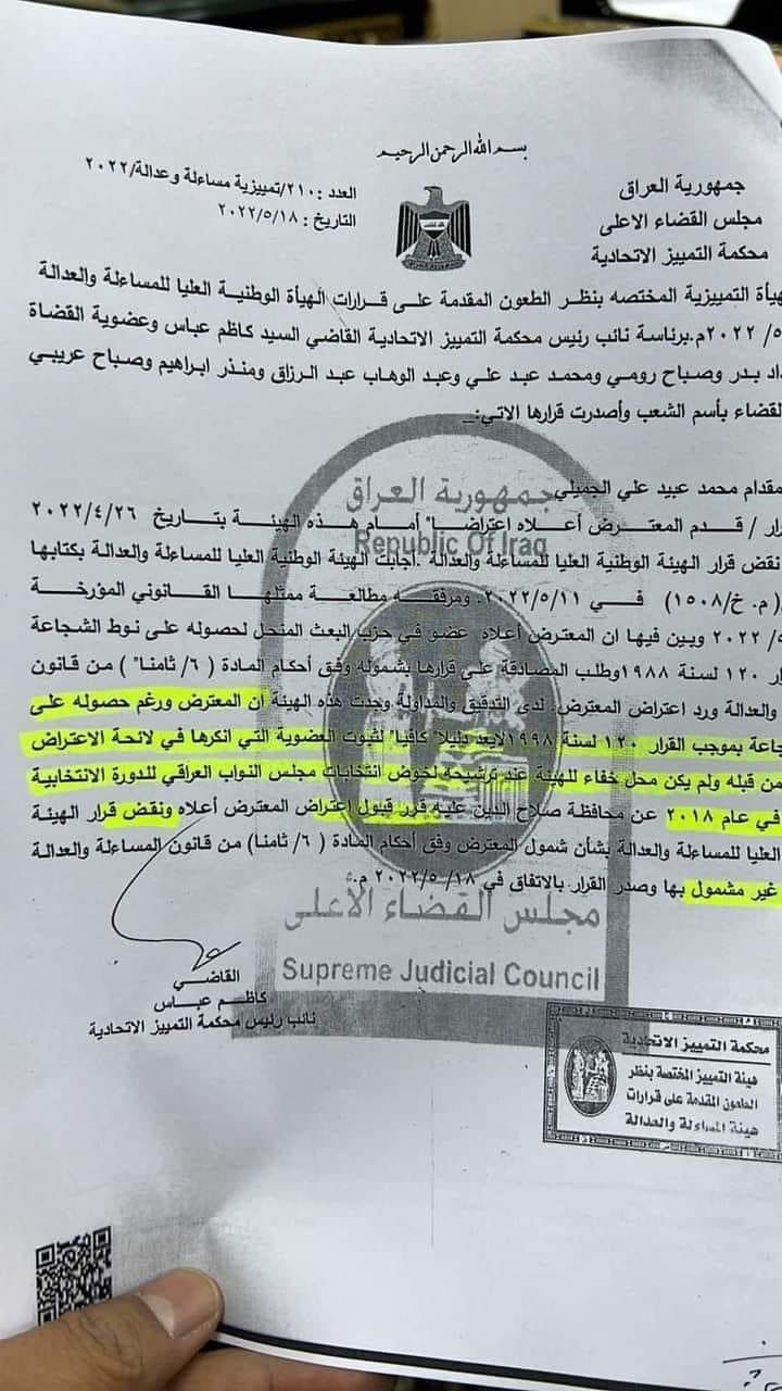 أعلنت محكمة التمييز الاتحادية، اليوم الأربعاء، صحة عضوية "مقدام الجميلي" في مجلس النواب بدل مشعان الجبوري.