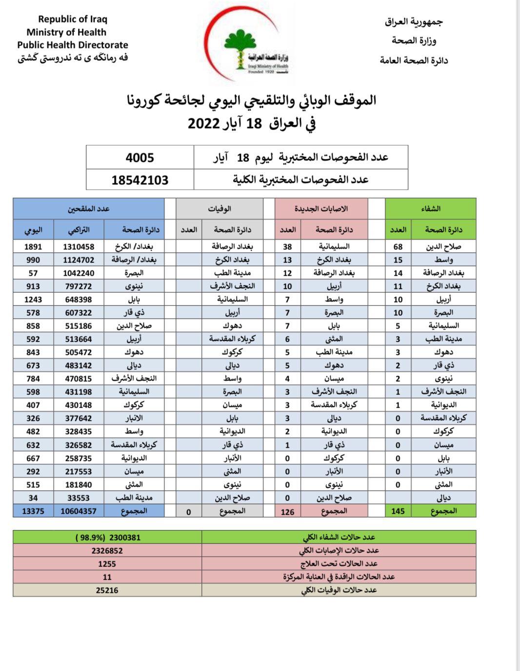 أعلنت وزارة الصحة، اليوم الأربعاء، الموقف الوبائي والتلقيحي اليومي لجائحة كورونا في العراق.