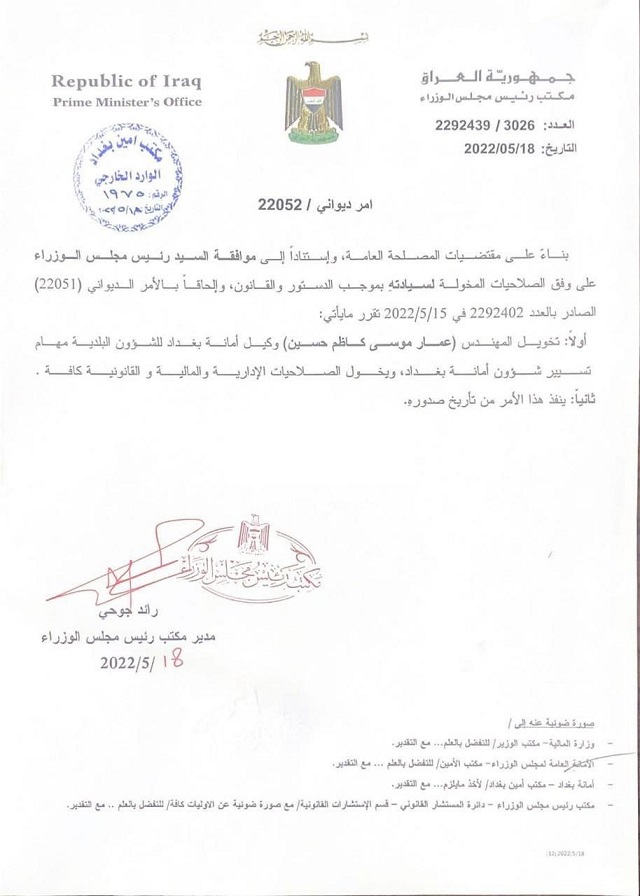 وأظهرت وثيقة  أن الكاظمي "وافق على تكليف عمار موسى الاسدي الوكيل البلدي بتسيير شؤون امانة بغداد وتخويله بالصلاحيات الإدارية والقانونية كافة".