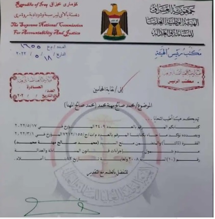وأبلغت الهيئة، نقابة المحامين العراقيين، في وثيقة أنها “منحت المهنا كتابا بعدم شموله بإجراءاتها”.
