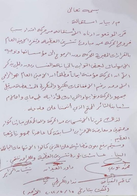 وبينت الوثيقة ، "استقالة خمسة نواب من حركة امتداد بسبب "خروج الحركة عن مبادئ تشرين العظيمة وتفرد الأمين العام بالقرارات المصيرية للحركة دون الرجوع إلى مؤسساتها، بحسب النواب المستقيلين".