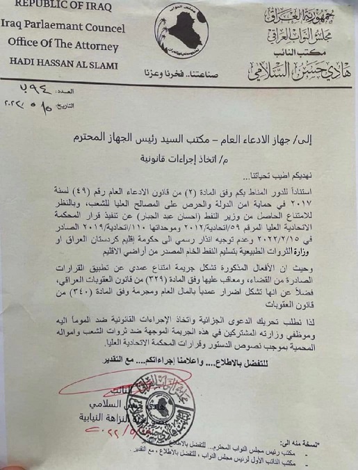 وبحسب وثيقة صادرة عن السلامي فإنه "بالنظر للامتناع الحاصل من وزير النفط احسان عبد الجبار عن تنفيذ قرار المحكمة الاتحادية وعدم توجيه انذار رسمي الى حكومة اقليم كردستان او وزارة الثروات الطبيعية بتسليم النفط الخام المصدر من أراضي الاقليم، وحيث ان الافعال المذكورة تشكل جريمة امتناع عمدي عن تطبيق القرارات الصادرة من القضاء ومعاقب عليها وفق المادة (329) من قانون العقوبات العراقي فضلا على انها تشكل اضرارا عمديا بالمال العام ومجرمة وفق المادة (340) من قانون العقوبات".