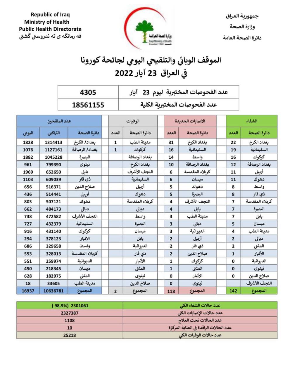 اعلنت وزارة الصحة، اليوم الاثنين، عن الموقف الوبائي والتلقيحي في عموم البلاد لهذا اليوم.