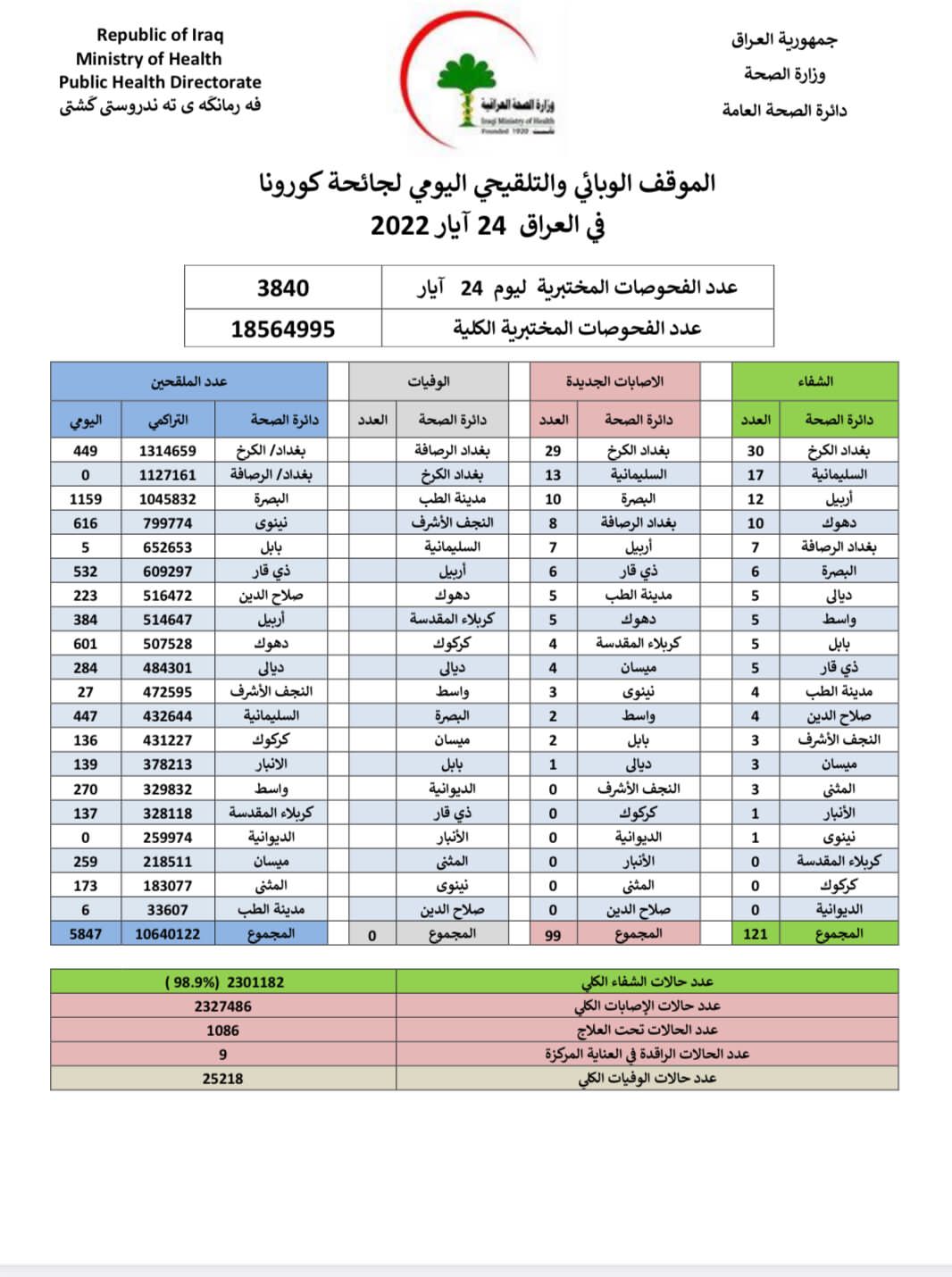 عدد الإصابات: 99 عدد حالات الشفاء: 121 عدد حالات الوفاة: 0اشترك في قناة وكالة انباء براثا على التلجرام https://telegram.me/buratha