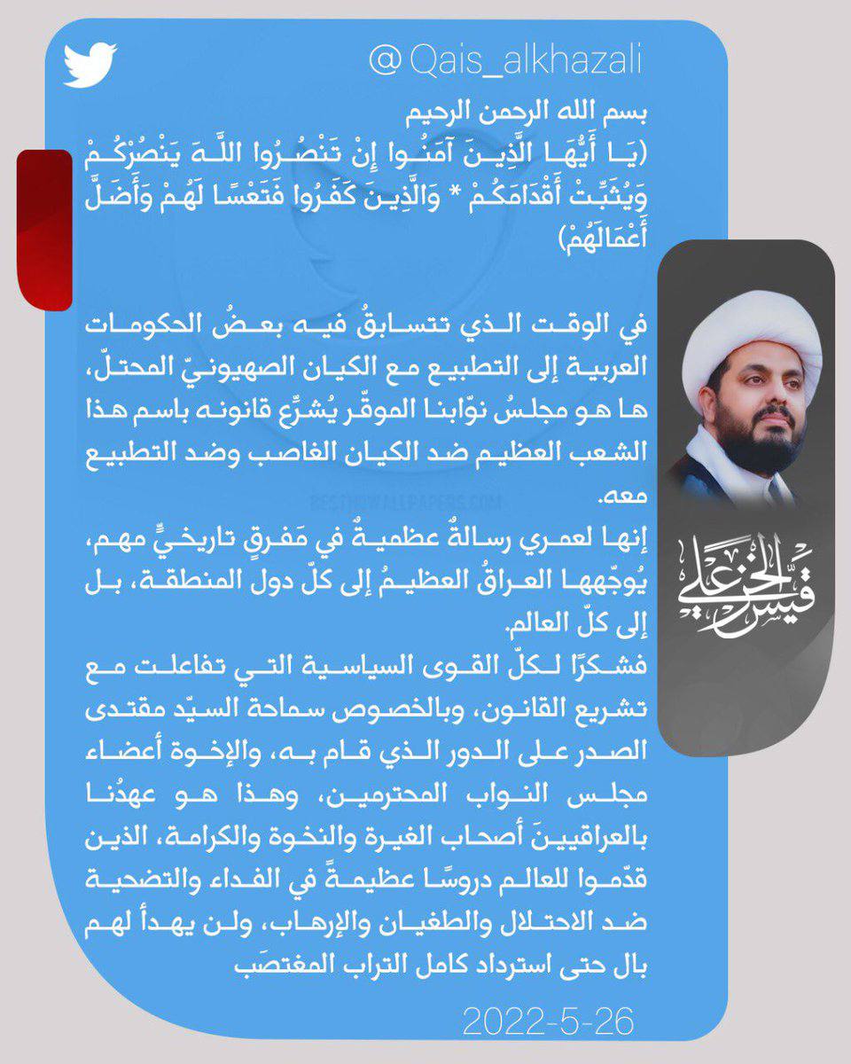 وكتب الشيخ الخزعلي في تدوينة على “تويتر” تابعتها ايرث نيوز “في الوقت الذي تتسابق فيه بعض الحكومات العربية الى التطبيع مع الكيان الصهيوني المحتل، ها هو مجلس نوابنا الموقر يشرع قانونه باسم هذا الشعب العظيم ضد الكيان الغاضب وضد التطبيع معه”.