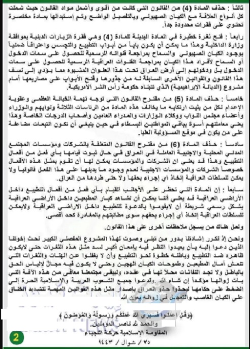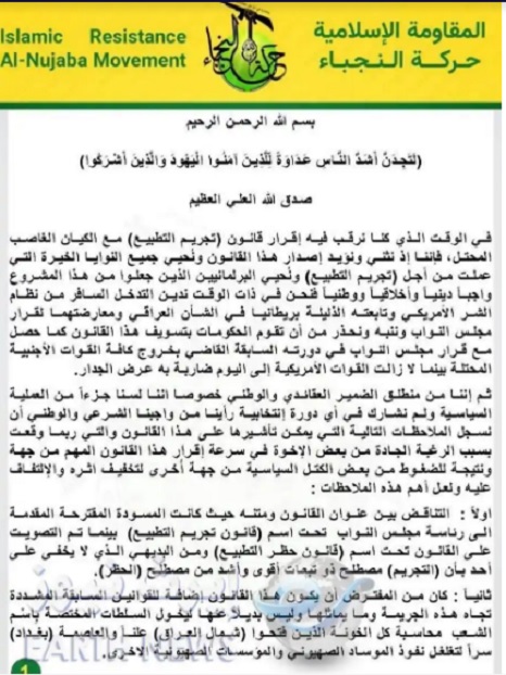 حركة النجباء تُشكل بـ 7 نقاط على قانون “تجريم التطبيع” وتحذر من “باطنه”