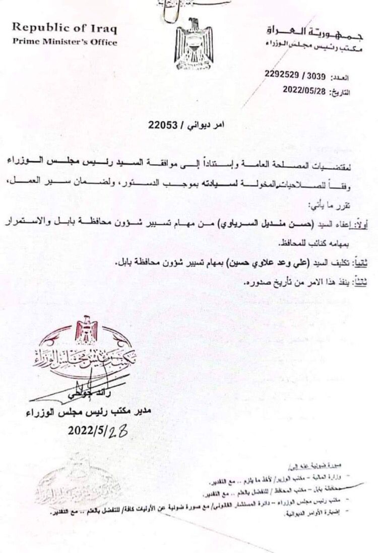 وجاء في وثيقة مذيلة بتوقيع مدير مكتب رئيس رئيس مجلس الوزراء، صادرة اليوم السبت، "لمقتضيات المصلحة العامة واستناداً إلى موافقة رئيس مجلس الوزراء مصطفى الكاظمي ووفقاً للصلاحيات المخولة له بموجب الدستور، ولضمان سير العمل، تقرر إعفاء حسن منديل من مهام تسيير شؤون محافظة بابل والاستمرار بمهامه كنائب للمحافظ".