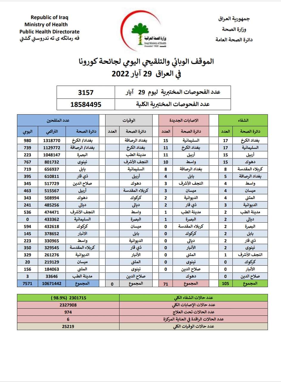 أعلنت وزارة الصحة، اليوم الأحد، الموقف الوبائي والتلقيحي اليومي لجائحة كورونا في العراق.