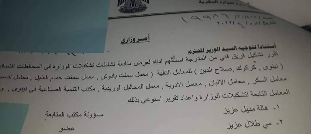 وتتضمن الوثيقة قيام الخباز بتكليف ابنته وبنات شقيقه بمسؤولية متابعة شركات وزارة الصناعة والمعادن في المحافظات الشمالية.