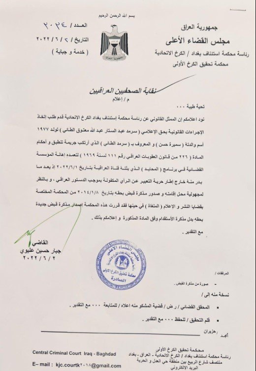 وبحسب وثيقة خاطب مجلس القضاء الاعلى/ محكمة تحقيق الكرخ الأولى، نقابة الصحفيين، ابلغت فيها النقابة باتخاذ الاجراءات القانونية بحق الكاتب الصحفي (سرمد الطائي)، بتهمة الاساءة الى المؤسسة القضائية.