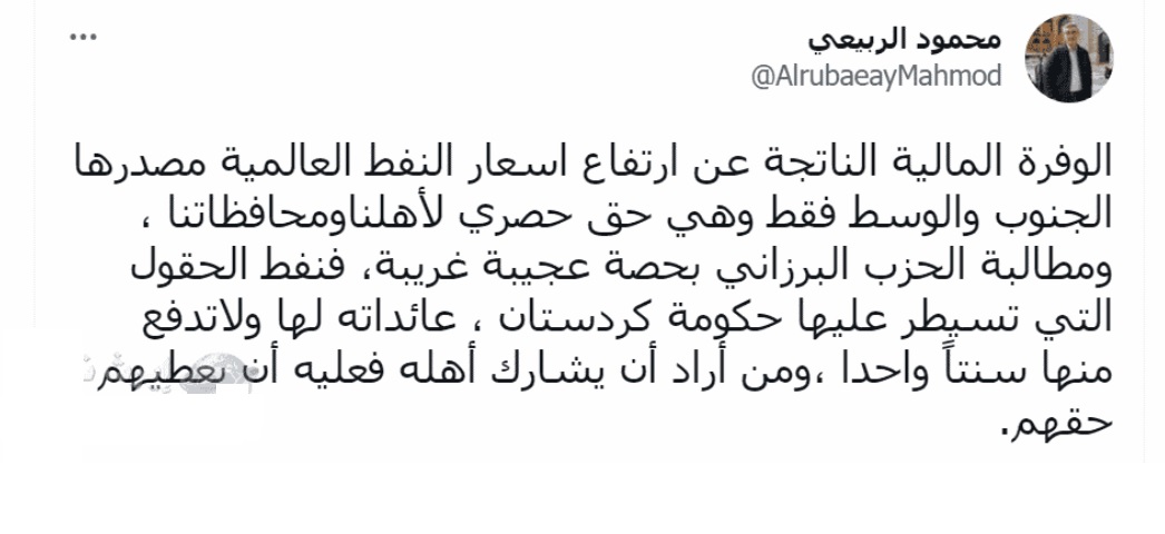 وكتب الربيعي في تدوينة على منصة “تويتر” أن “الوفرة المالية الناتجة عن ارتفاع اسعار النفط العالمية مصدرها الجنوب والوسط فقط وهي حق حصري لأهلناومحافظاتنا”.
