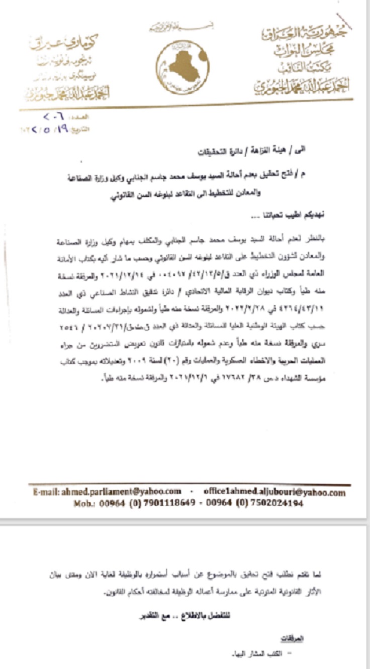 وقال الجبوري بحسب وثيقة ، أنه "بالنظر لعدم إحالة "يوسف محمد جاسم الجنابي" والمكلف بمهام وكيل وزارة الصناعة والمعادن لشؤون التخطيط، إلى التقاعد لبلوغه السن القانوني وحسب ما اشار اليه بكتاب الامانة العامة لمجلس الوزراء، وكتاب ديوان الرقابة المالية الاتحادية / دائرة تدقيق النشاط الصناعي، ولشموله باجراءات المساءلة والعدالة، حسب كتاب الهيئة الوطنية العليا للمساءلة والعدالة، وعدم شموله بامتيازات قانون تعويض المتضررين من جراء العمليات الحربية والاخطاء العسكرية والعمليات وتعديلاته بموجب كتاب مؤسسة الشهداء".