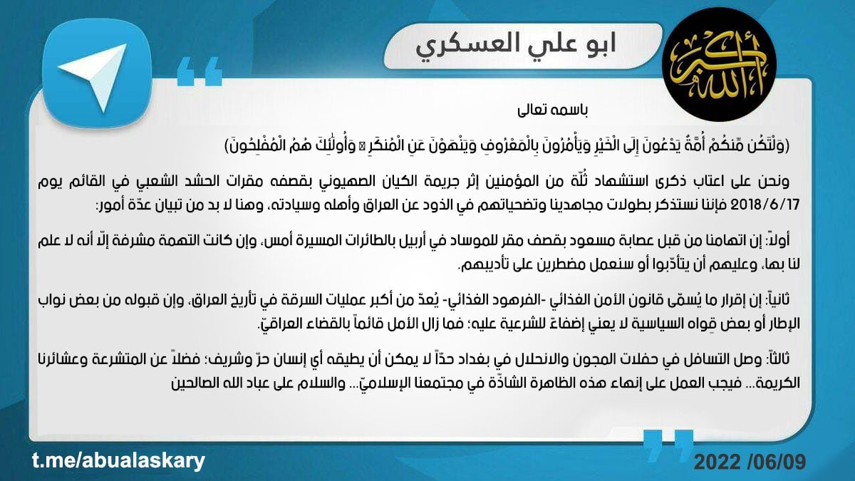 الناطق باسم كتائب حزب الله أبو علي العسكري: قانون “الفرهود الغذائي” أكبر سرقة بتاريخ العراق.. لدينا أمل بالقضاء (تغريدة)