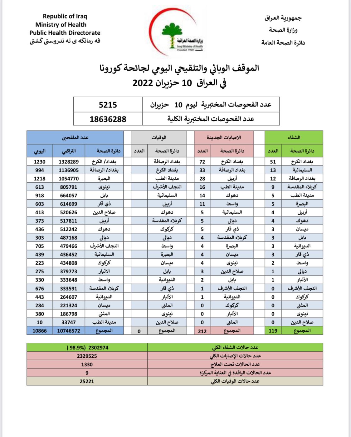 أعلنت وزارة الصحة، اليوم الجمعة، الموقف الوبائي والتلقيحي اليومي لجائحة كورونا في العراق.