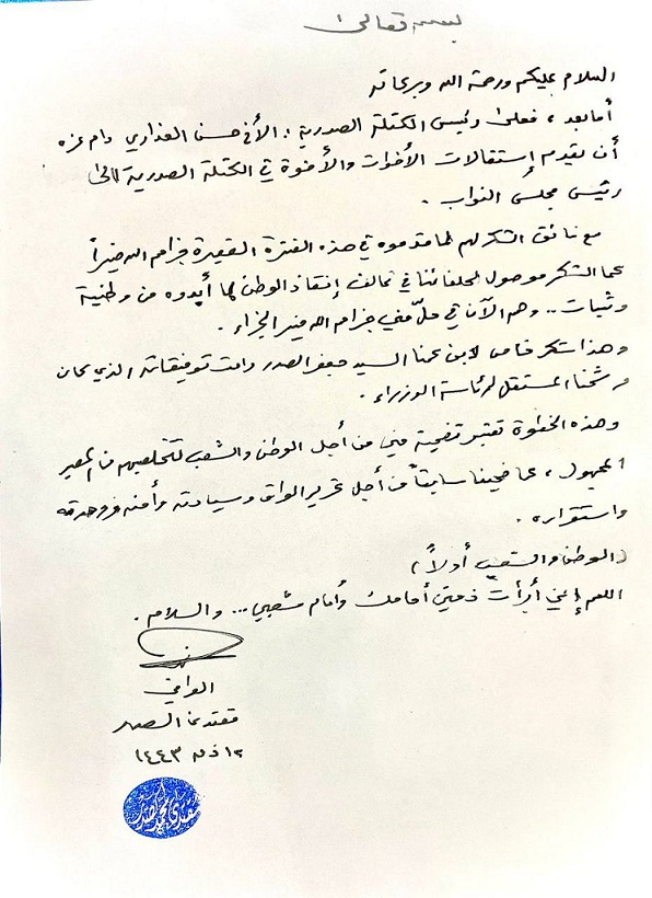 وقال الصدر في بيان إنه "على رئيس الكتلة الصدرية حسن العذاري أن يقدم استقالات نواب الكتلة الى رئيس مجلس النواب. مع فائق الشكر لهم لما قدموه في هذه الفترة القصيرة فجزاهم الله خير الجزاء".