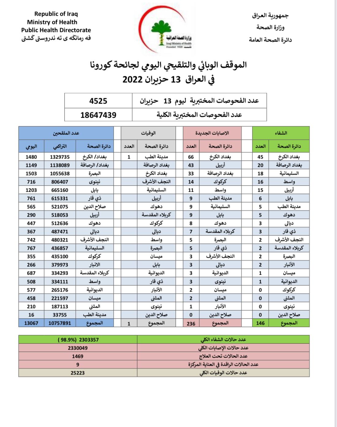 أعلنت وزارة الصحة، اليوم الاثنين، الموقف الوبائي اليومي الخاص بجائحة كورونا في عموم العراق.