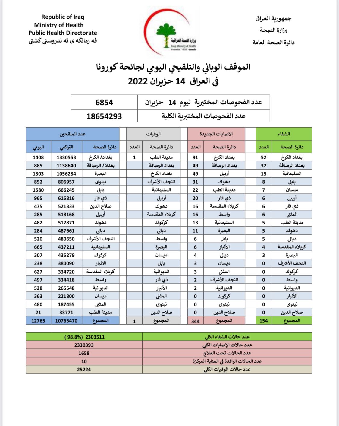 أعلنت وزارة الصحة، اليوم الثلاثاء، الموقف الوبائي والتلقيحي اليومي لجائحة كورونا في العراق.